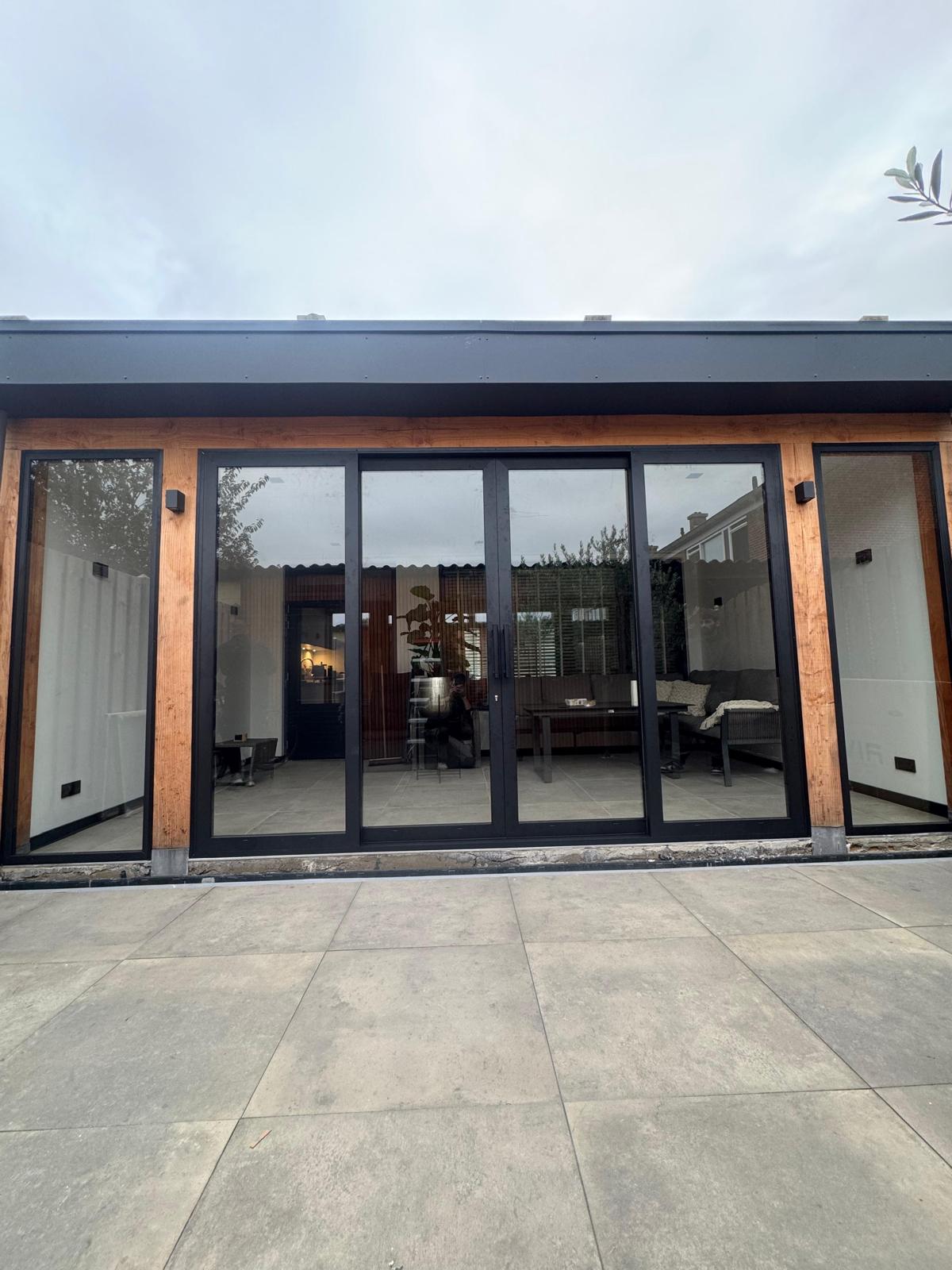 De glazen schuifwanden werken soepel en sluiten perfect af. Ze houden wind en regen buiten en geven toch een open gevoel.